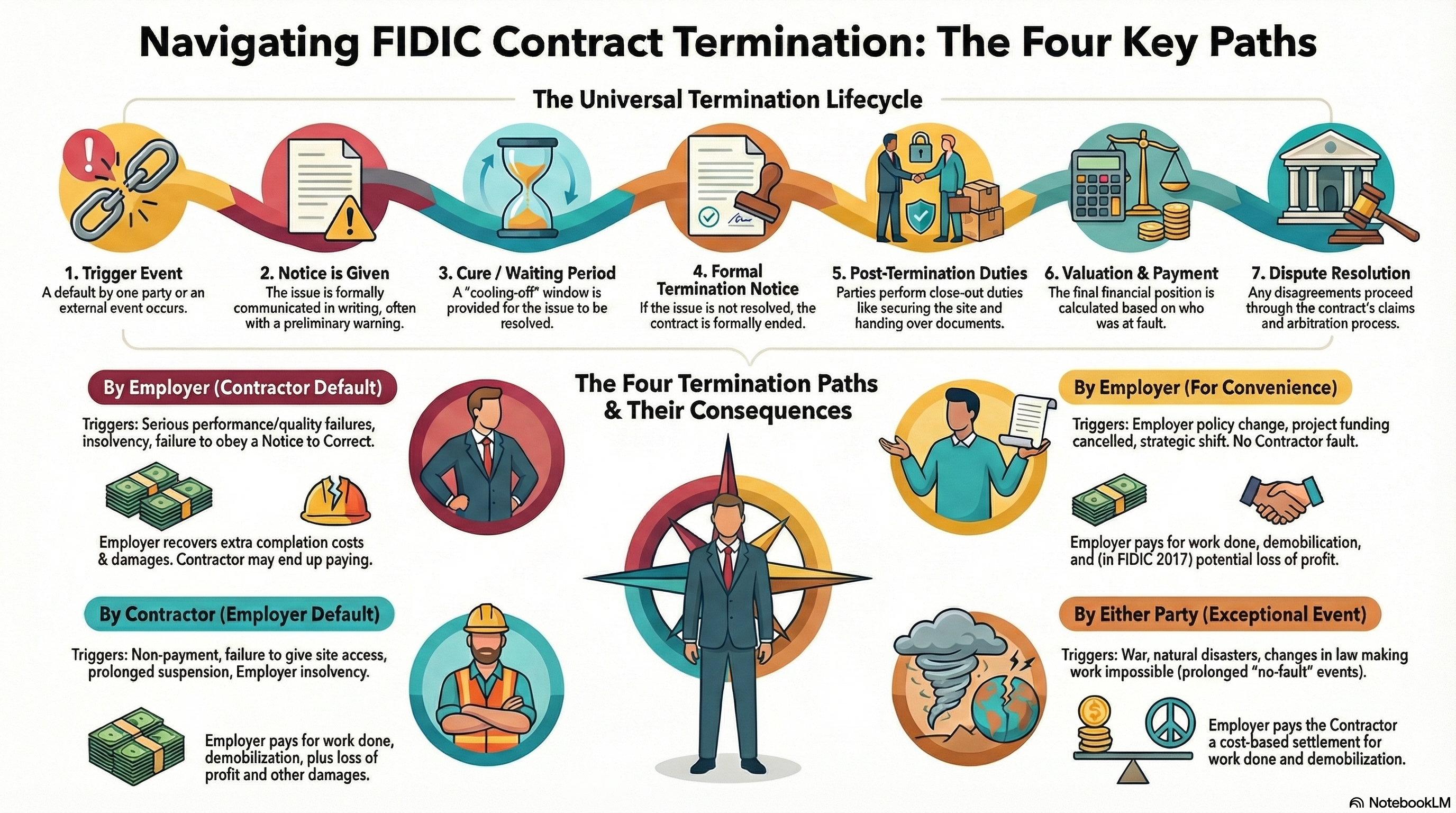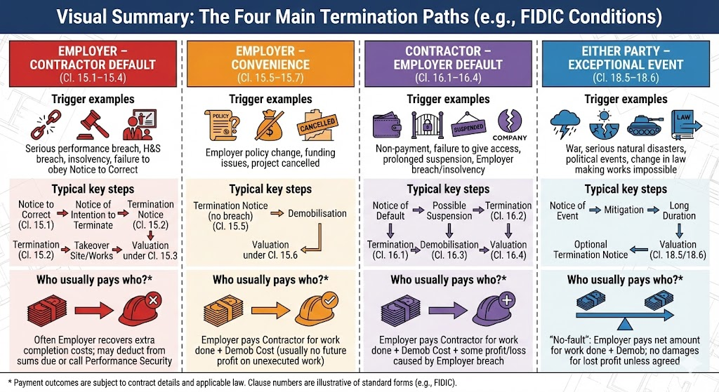 A one-screen map of the four FIDIC termination routes: what triggers each path, the typical steps, and – crucially – who usually ends up paying whom.
